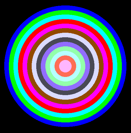 #include <graphics.h> int main() { int gd = 0, gm = 9, i, color = 1; initgraph(&gd, &gm, NULL); { for (i = 10; i <= 200; i = i + 15) { setcolor(color++); pieslice(320, 240, 0, 360, i); delay(100); } int gd = 0, gm = 9, i, color = 1; for (i = 200; i >= 10; i = i - 15) { setcolor(color++); pieslice(320, 240, 0, 360, i); delay(100); } } delay(7000); return 0; }